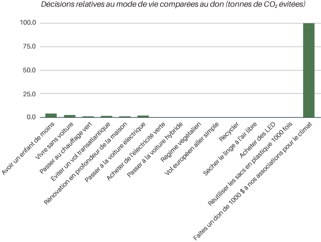 Impact relatif des choix de mode de vie par rapport aux dons à des organisations caritatives efficaces dans le domaine du climat (Source : Founders Pledge – Rapport sur le climat et le mode de vie).