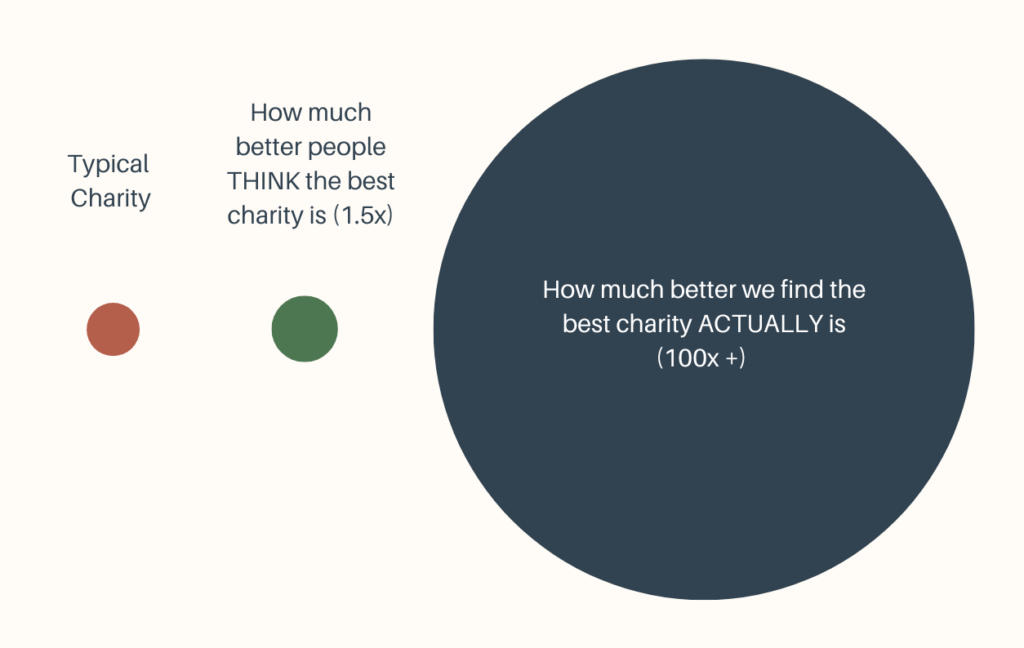 Based on the evidence presented, the difference between the best and the rest of charities is much, much larger (coarsely illustrated below). We (Mieux Donner) have published an article showing similar evidence on other areas.
